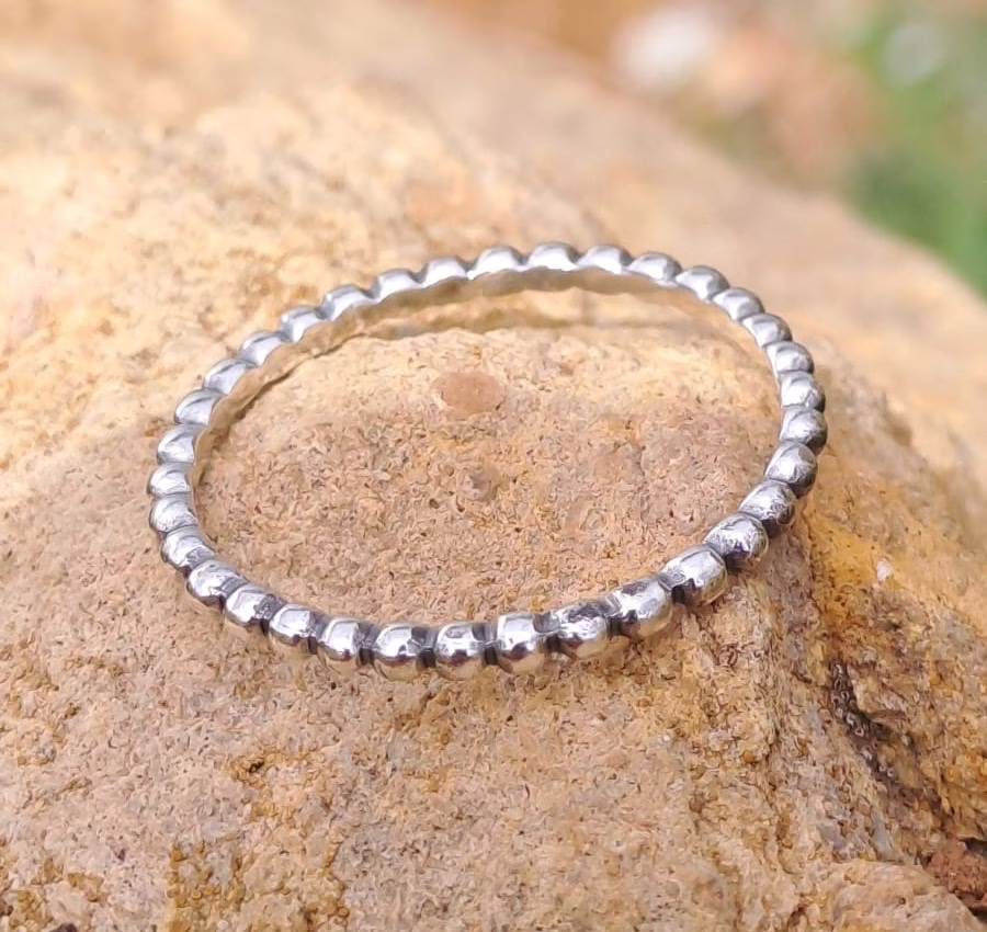 Este anillo de bolitas, hecho a mano en plata de ley 925 maciza, es una pieza ligera, cómoda y perfecta para el día a día. Su diseño formado por pequeñas esferas crea un efecto delicado y moderno, ideal para llevar solo o combinar con otros anillos. Una joya versátil con carácter artesanal que nunca pasa de moda.