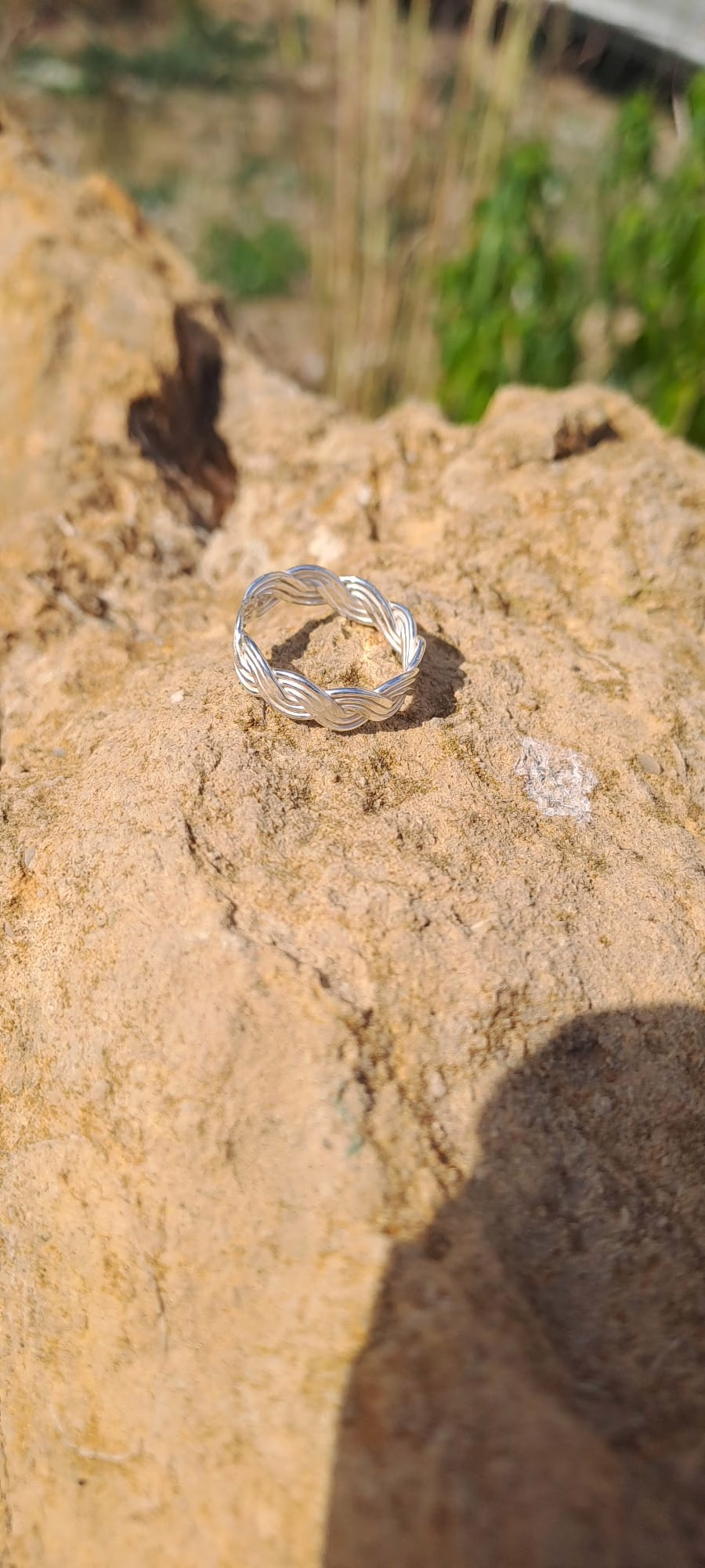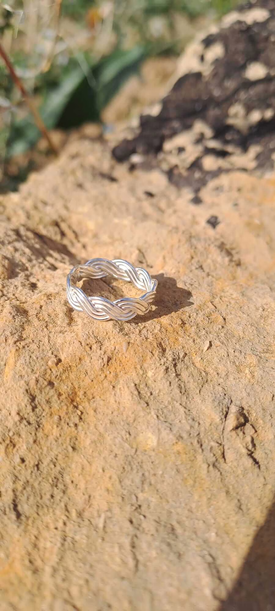 Este anillo trenzado está hecho totalmente a mano con seis hilos de plata maciza de 0,8 mm, entrelazados con precisión para crear una pieza con textura, equilibrio y carácter. Es cómodo, resistente y perfecto para el uso diario. Su diseño unisex lo convierte en una joya versátil, ideal tanto para mujer como para hombre.