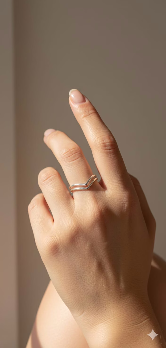 Este anillo Doble V en plata de ley 925 es una pieza minimalista, elegante y con mucha presencia.