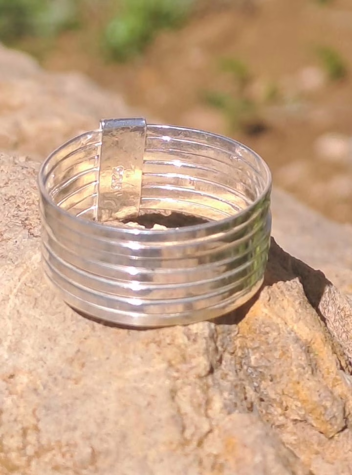 Este anillo semanario de plata maciza está compuesto por siete finas anillas unidas en una sola pieza, trabajadas completamente a mano. Su diseño minimalista y atemporal lo convierte en una joya versátil, ideal para el día a día. Cómodo, resistente y con carácter propio, es una pieza que equilibra artesanía y estilo con total naturalidad.