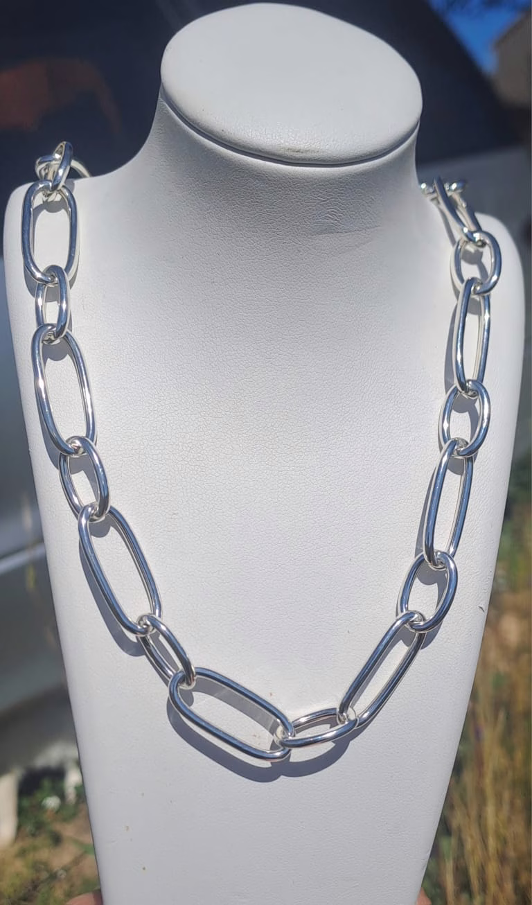 Esta cadena de plata de ley, de estilo gargantilla, es una joya con presencia. Sólida, elegante y cuidadosamente pulida, destaca por sus eslabones de 2 mm de grosor y su acabado limpio y atemporal. Su longitud de 45 cm permite que se lleve ceñida al cuello, realzando su forma y sofisticación.